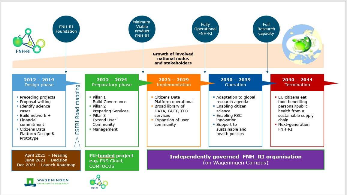 The FNH-RI timeline reflects the evolution of its vision, mission, governance and offers to the research community. FNH-RI is intended to generate a return on member states’ investments through broad impacts on research and development and through improvements in the health and sustainability of citizens’ diets.